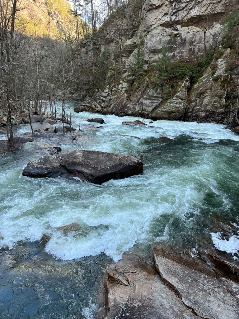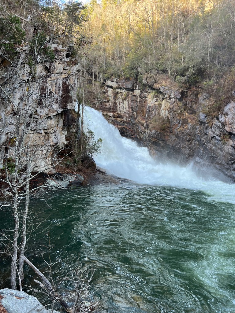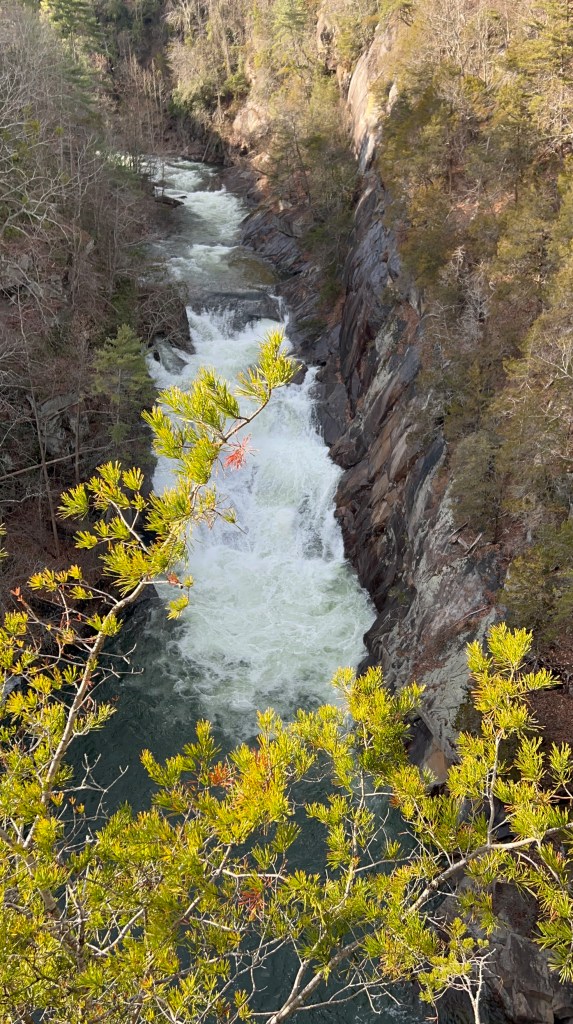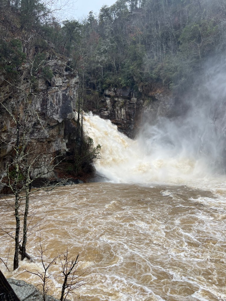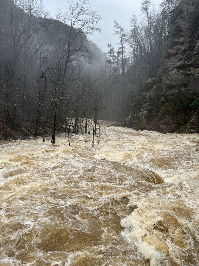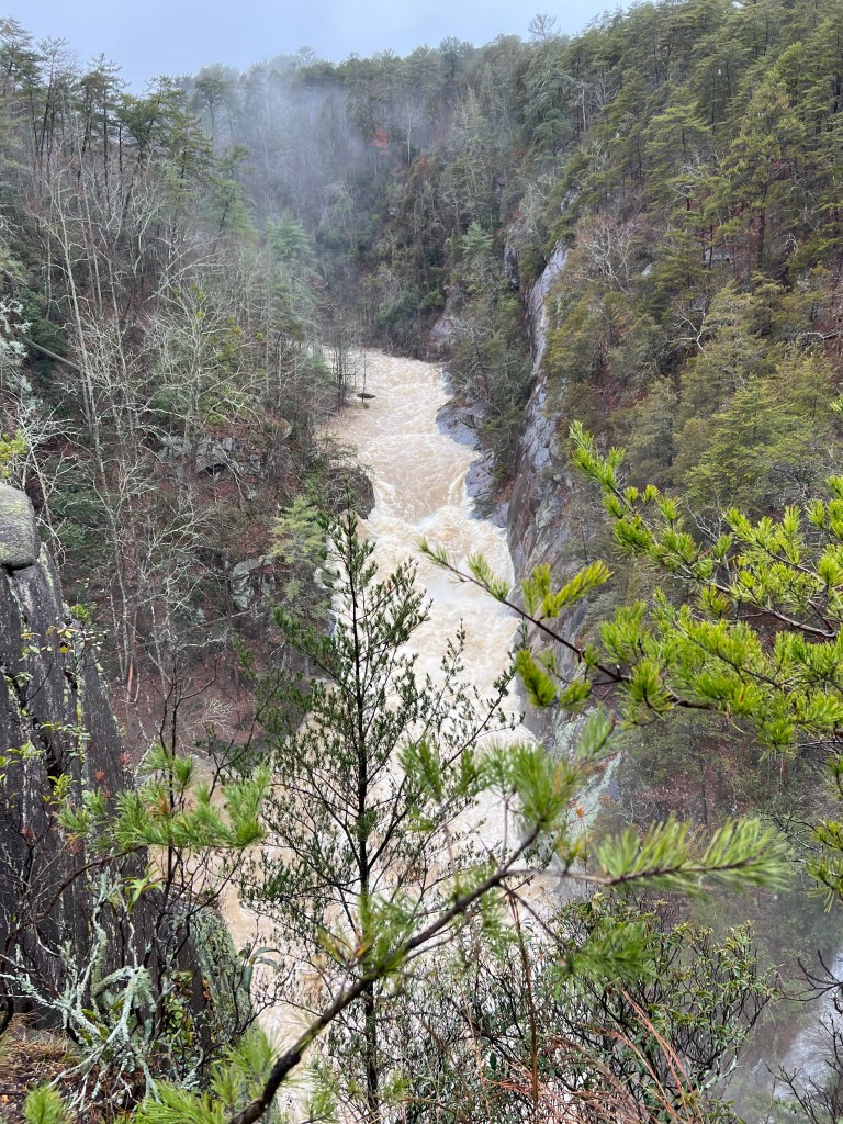 We got between 5 and 6 inches of rain in a day down here with winter storm Finn and we got to see what this gorge is like when they have 7 fins open on the Tallulah AP Powerhouse Dam and the are pouring water out of Tallulah Lake to keep everything up stream from flooding.