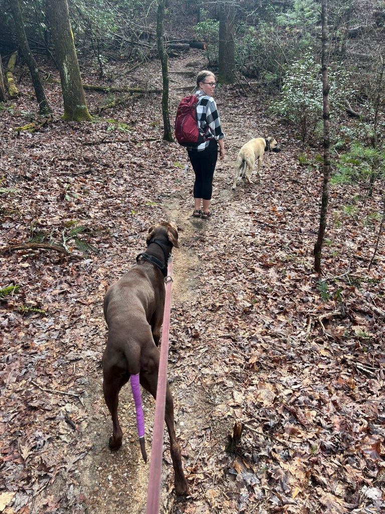 The Trail we hiked is about 1.5 miles and was an easy hike through the woods. Toward the end you hike next to the river in the park. Then Through a Large field that was pretty wet when we walked through.